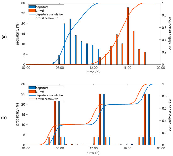 The mobility pattern of each user group includes original destination matrices according to Bosserhoff [23]. These matrices describe the relative proportion of arriving and departing vehicles in each hour of the day in relation to the total amount of vehicles of one day (24 h). Finally, cumulative distribution functions of arriving and departing vehicles are generated for these daily distributions. Two examples of original daily distributions according to Bosserhoff for the purpose “trip home” and “trip to work-shift operation” as well as the respective cumulative distributions are shown in Figure 1 [11]. Furthermore, by using the daily distributions of arrivals and departures, as step 1, relative distributions of the present vehicles can be derived for every hour: from the vehicles present at the beginning of an hour, the departing vehicles are added and the departing vehicles are subtracted. In step 2, the average duration of stay at the considered location will be calculated. From the daily distribution of the vehicles present, the sum of the duration of stay of all vehicles can be calculated. This sum divided by the number of arrived vehicles gives the average duration of stay per vehicle.