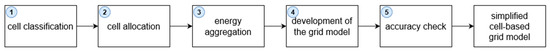 The simplified cell-based grid model presented here is developed in five steps as shown in Figure 4: (i) cell classification, (ii) cell allocation, (iii) energy aggregation, (iv) development of the grid model and (v) accuracy check. If a grid model containing several voltage levels is to be developed, steps 2 to 4 must be repeated for each voltage level [11].