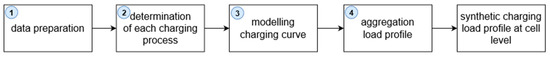 For the determination of the synthetic charging load profiles for the e-mobility we apply as shown in Figure 5, four steps: (i) data preparation, (ii) determination of each charging process, (iii) modelling charging curve and (iv) aggregation of the load profiles [11].