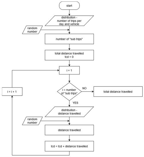 The extension regarding the selection of the considered user groups consists of creating a trip chain for the selected user groups, which takes place in step 2. The creation of such a trip chain is necessary because the selection of user groups means that there is no longer a charging process after each trip. Therefore, the trips of the non-selected user groups are cumulated into the selected ones, so that the distances travelled by the non-selected user groups can be considered. For this purpose, a trip of the selected user groups consists of several “sub trips”, e.g., the trip chain: “working - living - shopping - working” of the user group “trip to work with a private car” consists of three “sub-steps”. For each trip of the selected user groups resulting from step 1, the total distance travelled is determined as shown in Figure 6. For this, the number of “sub trips” is defined by applying the probabilistic approach to the statistical distribution of the number of trips made per day and vehicle. Subsequently, the distances travelled are determined for each “sub trip” and summed up, so that the charging curve is modelled, based on the total distance travelled.