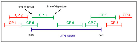 The defined time span is used to decide for each charging process whether it can be shifted or not, see Figure 7. As a generic example, it is not possible to shift the charging processes CP 1 to CP 4 (red) into the time span, because their time of arrival and their time of departure are before or after the defined time span. This means that this charging process takes place at the original time as defined in charging strategy 1. In principle, the charging processes CP 5 to CP 9 can be shifted into or within the time span. During the shifting and sequencing of the charging process, it must be ensured that this is only possible within the duration of stay of the EV, with the boundary condition that the EV is fully charged at the time of departure. For example, if charging process CP5 is shifted to the start of the time span and the remaining time is not sufficient for a fully charged EV, the charging process will also take place at the original time as defined in charging strategy 1.