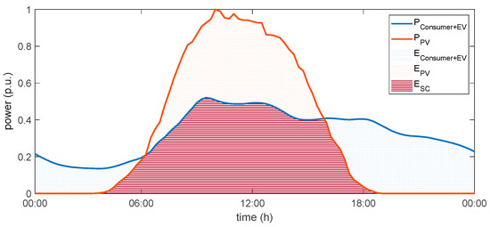 To explain the DSG, DSS and SCR, Figure 8 shows a generic load profile (consumer and EV) and a generic PV production profile as an example.