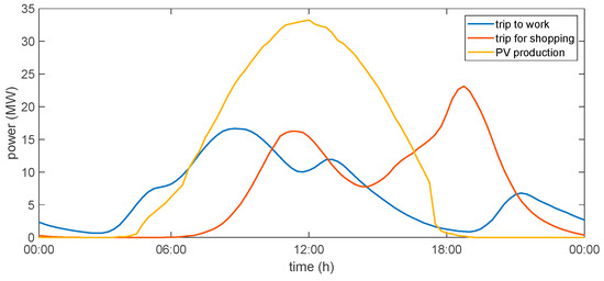 Generic example of a load profiles of the user groups “trip to work” and “trip for shopping” as well as a PV production profile.