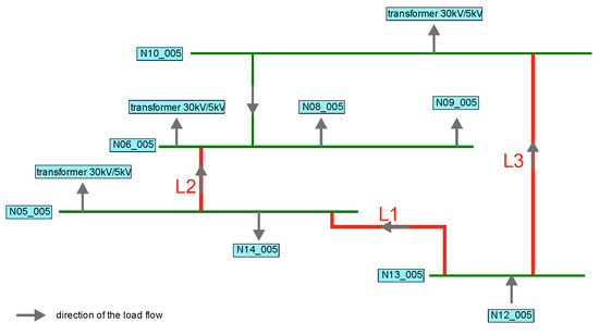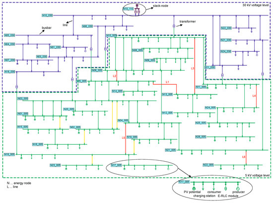 The original medium-voltage grid of the city of Leoben is divided into 26 energy cells. Figure 10 illustrates the developed simplified cell-based grid model, where the 30 kV voltage level is shown in blue and the 5 kV voltage level in green. To clearly distinguish the two voltage levels, the 30 kV level is marked with the ending _030 and the 5 kV level with the ending _005. Since the 30 kV voltage level is not designed to cover the complete area of Leoben, not every cell has a connection to the 30 kV voltage level. The 110 kV voltage level of the Leoben substation was chosen as the slack node, so that the load flows between the 30 kV and 110 kV voltage level can also be analysed. The slack node thus corresponds to the energy node N10_110. Since there are two 110 kV/30 kV transformers in the substation due to redundancy, both are also shown in the grid model.