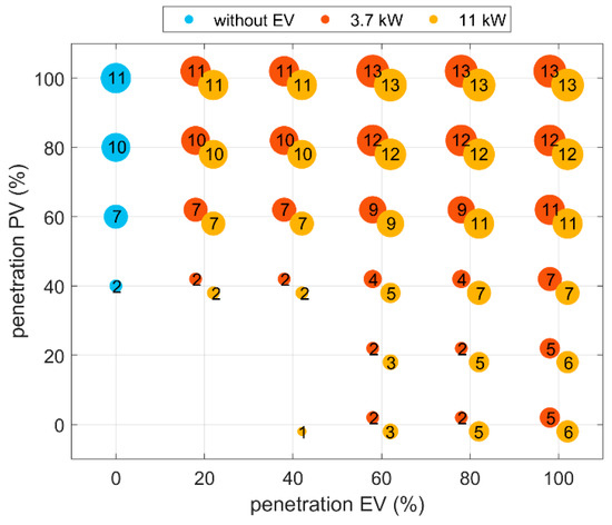 The number of overloaded lines of the 5 kV voltage level with corresponding penetration of EV and PV for the charging capacities 3.7 kW and 11 kW and charging strategy 1 is shown in Figure 11. Since a penetration of 0% EV only takes into account the demand for e-mobility that is already present in the status quo of the power grid, no additional charging power is assigned to these scenarios and they are therefore referred to as without EV. With increasing EV and PV penetration as well as charging power, the number of overloaded lines increases. The use of PV potentials without e-mobility leads to line overloads at penetration rates of 40% PV and higher. E-mobility without PV potential, too, only causes line overloads when the penetration rate is over 40% and the charging power is 11 kW. With a penetration of 20% PV, the line overload caused by a penetration of 40% EV and a charging power of 11 kW can be avoided.