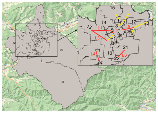 In addition to the number of overloaded lines, the model also determines which lines are affected and where they are located in the power grid model and geographically. Figure 12 shows the cell division for the energy cells of the city of Leoben and the geographical location of the 13 overloaded lines, with the six most stressed lines in red. The identification of the most stressed lines is based on the maximum utilisation of the overloaded lines and the duration of the overload for all scenarios. These overloaded lines are also illustrated in Figure 10, which shows the grid plan of the cell-based grid model.