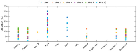 With the exception of the already mentioned avoidance of line overload at a penetration of 40% EV with a penetration of 20% PV, the different combinations of the penetrations of PV and EV do not lead to a reduction of the number of overloaded lines. Therefore, according to Figure 11 there are no obvious positive synergies between e-mobility and PV potential for charging strategy 1 for the number of overloaded lines. To investigate the interaction between e-mobility and PV potential in more detail, we determine the maximum line utilisation and the duration of overloads. For this purpose, we examine when the maximum utilisations of the lines occur and whether this is caused by the penetration of EV or PV. As illustrated for the most stressed lines in Figure 13, line overloads occur mainly in winter as well as in April and June. While the overloads in winter are due to load peaks of e-mobility, those in April and June are mainly due to production peaks of PV potentials. Furthermore, the worst-case weeks are identified based on the time of occurrence of the maximum load. Those worst-case weeks, for example, are used to compare scenarios with uncontrolled and controlled charging (charging strategy 1 vs. charging strategy 2).