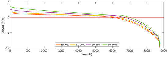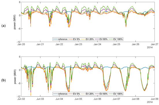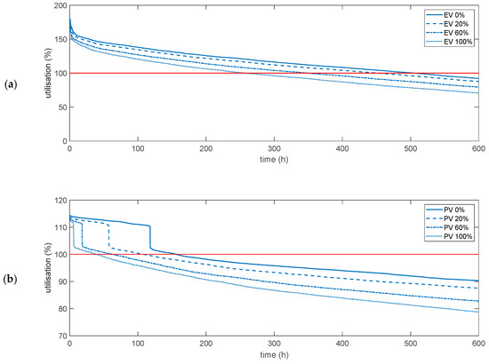 The duration of the overload shown in Table 2 is graphically illustrated in Figure 14 using the sorted annual duration curves of the line utilisation for the lines 1 (a) and 5 (b) for the range 0 to 600 h at a charging power of 3.7 kW. In addition to the already described reduction of the duration of the line overload, the decrease of the utilisation can also be seen. For the shown range (0 to 600 h) of the sorted annual duration curves, the comparison of the utilisation of line 1 at a penetration of 0% EV with the utilisation at a penetration of 100% EV shows a reduction of the utilisation between 6% and 19%. For line 5, a decrease in line utilisation of up to 15% is achieved for the range of 0 to 600 h of the sorted annual duration curve with an increase in penetration from 0% PV to 100% PV.