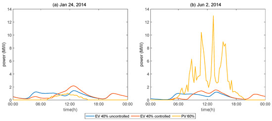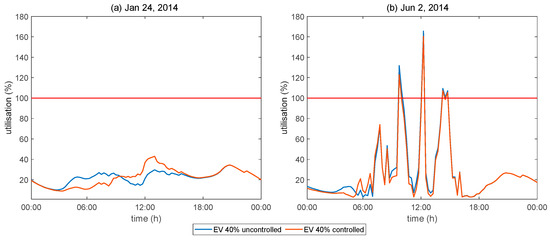 A comparison of the scenarios with charging strategy 1 and 2 based on two worst-case weeks is carried out to determine the influence of controlled charging on the grid utilisation compared to uncontrolled charging and the resulting synergy effects between e-mobility and PV potential. For this purpose, one week is in winter (20 January to 26 January) and one in summer (2 June to 8 June). The most stressed days of this week are 24 January and 2 June, respectively. The comparison of the line utilisation in Figure 15 shows for line 1 for a penetration of 40% EV and 60% PV and a charging power of 3.7 kW that controlled charging can lead to both, a reduction but also to an increase in the utilisation of the line. By applying charging strategy 2, the charging processes during the day are shifted into the peak of the PV production; thereby an increase of the power requirement of e-mobility can occur within the period of the peak of the PV potentials as shown in Figure 16.