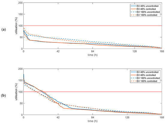 Annual duration curve of the utilisation for the period 0 to 600 h for 3.7 kW charging power and charging strategy 1 (a) line 1 and a fixed penetration of 60% PV (b) line 5 and a fixed penetration of 60% EV.