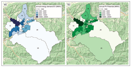To identify which of the seven user groups from the traffic analyses are particularly relevant for the investigation of the synergy effects between e-mobility and PV potential, the potential for the direct use of PV production per user group is examined. For the case study presented here, the user groups “trip for shopping”, “trip for execution” and “trip to work” have the highest energy demand in relation to the total energy demand of e-mobility based on the traffic analysis. Since the user groups “trip for shopping” and “trip for execution” have the same characteristic load profile, only the user groups “trip for shopping” and “trip to work” are shown as examples in Figure 9. The figure is used to visualize the determination of the potential for the direct use of PV production for the user groups “trip for shopping” and “trip to work”. For the user group “trip to work”, the user groups “trip to work with a private car” and “trip to work with a company car” are aggregated due to their similar behaviour. The characteristic of the synthetic charging load profile for the user group “trip to work” is strongly dependent on the sector-specific jobs within the considered area. Therefore, the evening peak, which occurs due to an existing shift operation, can be omitted when looking at another area. The number of peaks for the user group “trip for shopping” is independent of the area under investigation. This means that as soon as there are shopping facilities in the area under consideration, and thus a shopping user group exists, a peak at noon and in the afternoon or evening occurs. In the example shown, around 80% of the energy demand of the user group “trip to work” can be directly covered by PV production, while only 60% can be directly supplied for the user group “trip for shopping”.