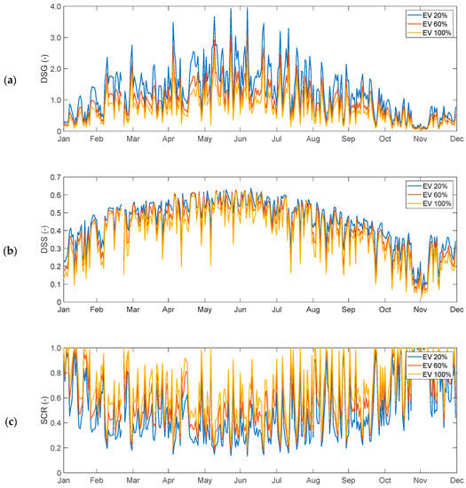 While the residual load is determined for each 15-min time step of the annual total load profile and the annual PV potential profile, the defined time frame for the determination of DSG, DSS and SCR is defined as one day (96 15-min time steps). The calculation of daily values, in comparison to the determination of an annual value, enables the seasonal consideration of the interaction between the e-mobility and PV potentials.