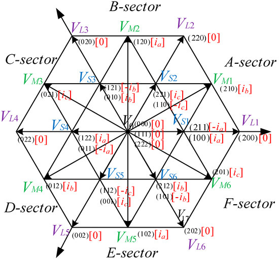 In recent years, the diode-clamped multi-level converter has been widely used in many fields due to its low switching stress and low harmonic distortion rates [1], such as power system DC transmission [2], reactive power compensation [3], active power filter and frequency conversion speed regulation of high-voltage high-power AC motor, etc. However, because the DC side capacitors of the converter are connected in series, the DC side voltage will be unbalanced [4]. Virtual space vector pulse-width modulation (VSVPWM) was first proposed for the capacitor voltage balance of three-level neutral-point-clamped (NPC) converters [5]. Through VSVPWM, the neutral current of the DC side is zero during the switching cycle, and the voltage of the capacitor can be well balanced within the range of full modulation and load power factor [6,7,8]. However, when the levels of diode-clamped multi-level converters increase, the implementation of VSVPWM is very complicated, and the amount of calculation will greatly increase, hindering its application in multi-level circuits. Therefore, VSVPWM is mainly used in three-level converter and when the level of the converter is greater than three levels, VSVPWM is rarely used. Compared with VSVPWM, the carrier-based pulse-width modulation (CBPWM) method appears earlier, it is easy to operate and implement [9,10], which is convenient for use in multi-level converters with greater than five levels, the theoretical and practical research has been relatively mature and widely used in practice. If the equivalent relationship between CBPWM and VSVPWM can be found, the modulation effect of VSVPWM can be realized by a simple and easy-to-implement CBPWM method, the application of VSVPWM can be extended to any level, and the advantages of VSVPWM can be fully utilized.