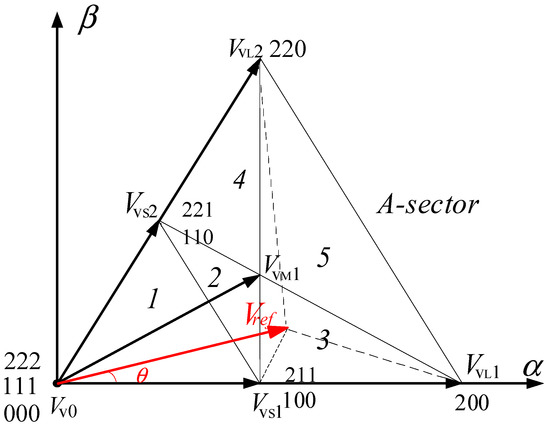 Taking n = 3 as an example to introduce the implementation process of VSVPWM. Figure 1 shows a three-level space vector diagram with six sectors, the total output of the converter is 27 switching states with 19 voltage vectors, which are divided into zero vector (V0), small vector (VS1~VS6), medium vector (VM1~VM6) and large vector (VL1~VL6). The neutral current generated by each switch state of each voltage vector as shown in [], and it can be seen that the zero vector and the large vector do not affect the midpoint voltage of the DC side capacitor, while the two switches of the small vector have the opposite effect on it. Besides, the medium vector will also generate a neutral current. In order to realize the voltage balanced control of the midpoint of the DC-side capacitor during the stable state, the new virtual medium vector and virtual small vector are defined. Take the A-sector as an example, as shown in Figure 2, the sector is re-divided into five sub-sectors, i.e., A1~A5. The corresponding relationship between the virtual vectors in Figure 2 and vectors in Figure 1 is as follows: