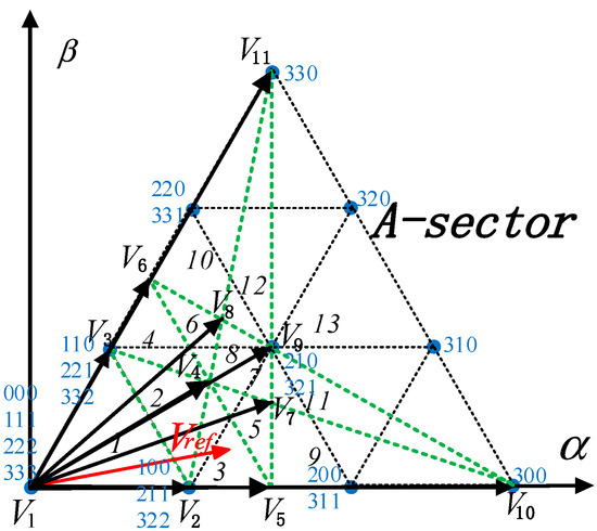 Similarly, for the four-level virtual space vector, as shown in Figure 3, the A sector is divided into 13 small sub-sectors, 11 new virtual vectors V1~V11 are defined. All these virtual vectors do not affect the midpoint voltage of the DC side capacitor, among which V5, V6, and V9 have two redundant states: