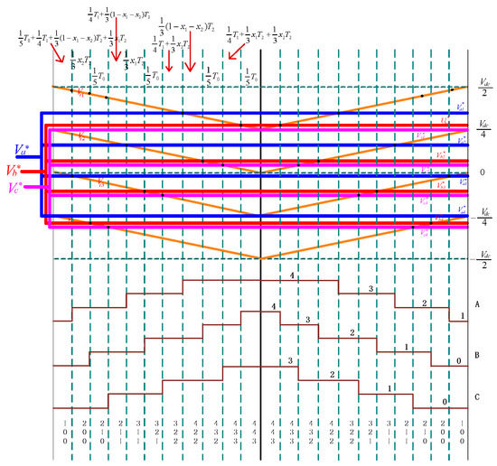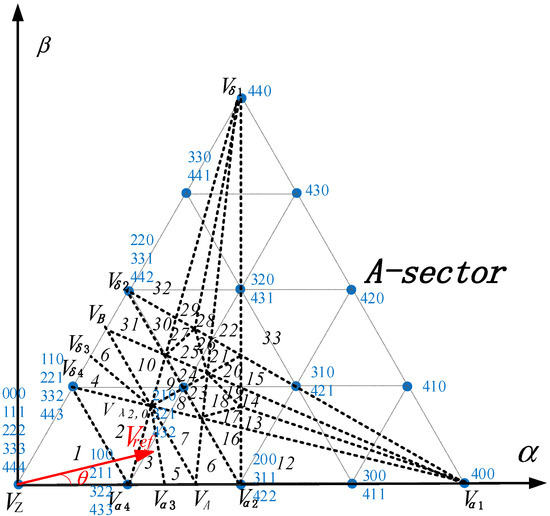 For the n-level main circuit, each phase can output n levels. In the first sector of the virtual space vector diagram in Figure 5, there are (n2 − 2n + 3) virtual vectors in total, some virtual vectors contain (n − 2) switch states. If the switch states of these redundant vectors are used on average, the modulation sequence of the 2 × (3n − 4) segment will be formed. Finally, the zero-sequence component superimposed of each phase is obtained as follows: