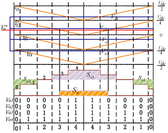 It can be seen from Table 1 that the modulation sequence of three-level VSVPWM in each sub-sector is 10 segments, but the traditional CBPWM can only output two levels per phase, and three-phase can output up to eight segments in the modulation sequence, so the traditional CBPWM modulation method cannot solve the above problem. This paper refers to the principle of modulation wave decomposition in reference [16] and decomposes n-level modulation waves into (n − 1) sub-modulation waves, so as to realize the output of multiple voltage states per phase. Assuming that the initial value of the modulated wave is Va*, and the number of levels is n = 5, four conventional CBPWM modulated waves Va1*, Va2*, Va3* and Va4* are obtained after decomposition, as shown in Figure 6. Then the same output as the modulated wave Va* can be achieved by the superposition of the output of the four conventional CBPWM modulation waves. Each sub-modulation wave intersects with the four in-phase stacked carriers respectively. After the superposition, the voltage of each phase contains five levels.
