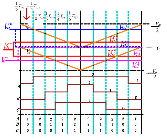 In Figure 2, the vectors in the A3 area can be synthesized by the adjacent virtual vectors VVSl, VVMl and VVLl, the virtual vector action times are TVSl, TVMl, and TVLl, respectively, which satisfy TS = TVSl + TVMl + TVLl. According to Equations (1) and (2), the small vector VSl (100) constitutes the virtual vector VVSl and VVMl, then the action time of the small vector VSl (100) in a switching cycle is: TS1 = TVS1/2 + TVM1/3. Considering the symmetry of the space vector modulation sequence in a switching cycle, the action time of the small vector VSl (100) in the first half of the switching cycle in Figure 7 is: TS1 = TVS1/4 + TVM1/6, the action time analysis of other vectors is similar.