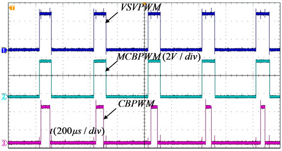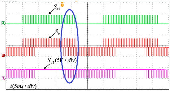 Figure 14 shows the switching state of A-phase Sa1 under three modulation modes of VSVPWM, MCBPWM and CBPWM. The switching state of VSVPWM and MCBPWM are exactly the same, indicating that the MCBPWM can realize the same modulation effect as VSVPWM. It can be seen from the above experimental waveform that the total output results and the results of each switch state under the two modulation methods are exactly the same, which proves the correctness of the equivalence relationship between VSVPWM and MCBPWM.