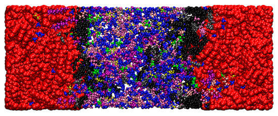 In this study, type Ⅱ-C kerogen monomers were used to construct realistic organic slits because the Ⅱ-C kerogen tended to be present in organic-rich shales []. We used a simplified shale oil component model including different molecular weight models (C1, C4, C8, C12, methylbenzene, asphaltene) [,,]. The details and structures of the kerogen molecules and shale oil models are provided in the Supporting Information, and the model of the slit system is shown in Figure 1. There were 26,899 atoms in the entire system. The dimensions of the simulation box were 40 Å3 × 50 Å3 × 200 Å3, and each kerogen matrix contained 15 kerogen monomers.