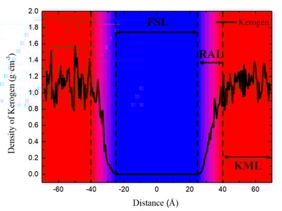 As shown in Figure 2, to more clearly describe the flow behaviour, we divided the system into three regions according to kerogen’s density profile. The KML density fluctuated at 1.1–1.2 g·cm−3 [,,]. The FSL was defined as the free space without kerogen, and the RAL was comprised of the cavities and protrusions of the kerogen between the KML and FSL. The widths of the FSL, RAL, and KML were 5 nm, 1.5 nm, and 2.5 nm, respectively. The roughness of the kerogen matrix’s two walls differed as a result of its amorphous structure, so we only used half of the system to analyse the shale oil fluid’s properties. Due to the random molecular thermal motion effects, there were always slight errors in the shale oil’s distribution. The kerogen wall friction also played a role in the difference between the two halves, but the friction was not our focus.