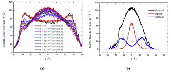 Using NEMD simulations, we simulated the shale oil flow through the kerogen slit under the driving force’s effect. Figure 3a shows that the shale oil density profile varied considerably at different driving forces. There were two density peaks in the boundary layer at a low driving force, consistent with our previous research []. The density profiles presented as a single peak in the middle of the slit at a larger driving force. The difference in the density was small below a driving force of 5 × 10−4 kcal/(mol·Å). Figure 3b shows that the methane density distribution peaked in the RAL region, and the asphaltene’s density peak was distributed in the FSL.