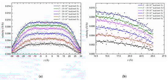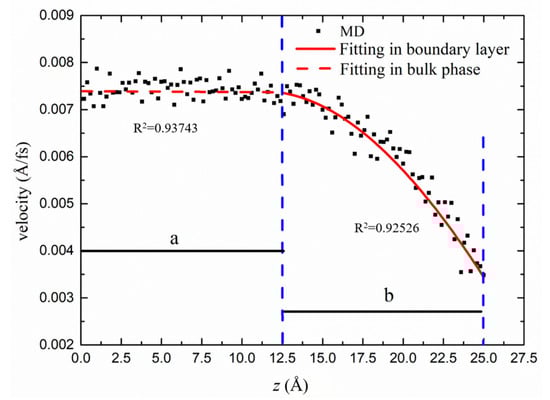 Although the linear distribution of the viscosity cannot perfectly describe the real viscosity, the velocity profile presented in Figure 8 calculated using the NEMD simulations fully fit with Equation (6) and Equation (7).