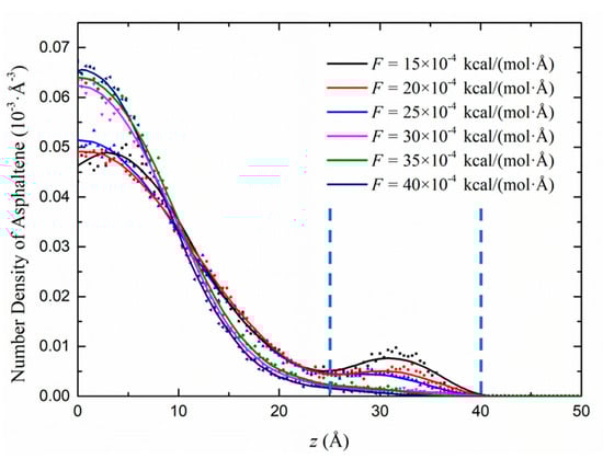 The velocity in the boundary layer increased homogeneously over forces of 30 × 10−4 kcal/(mol·Å), as shown in Figure 4b. By increasing the driving force, the fluid molecules had more kinetic energy, leading to stronger scattering effects. Figure 5 demonstrates that the driving force had a positive effect on the asphaltene density in the bulk phase, and the density profile stabilised beyond 30 × 10−4 kcal/(mol·Å). Due to the strong scattering, the asphaltene density peaks in the RAL were diminished. However, the asphaltene still adsorbed in the RAL and formed density peaks at driving forces below 30 × 10−4 kcal/(mol·Å). Therefore, the constant distribution of the asphaltene density facilitated a steady increase in velocity.