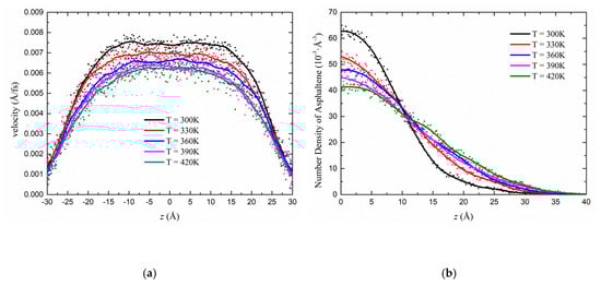 We compared the velocity profiles of the shale oil subjected to different temperatures, as shown in Figure 6a. In general, the fluid had a higher velocity as the temperature increased because the stronger thermal motion facilitated the reduction in viscosity. However, the velocity decreased and the asphaltene’s density profiles were gentler as the temperature increased, as shown in Figure 6.