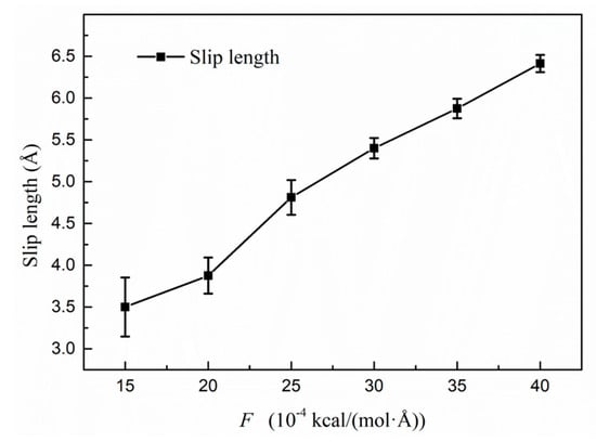 We calculated the slip length using Ls = usurf/(du/dr), where Ls is the slip length, usurf is the velocity at the slip wall, and du/dr is the velocity gradient at the interface []. As shown in Figure 7, the slip length increased steadily over a driving force of 30 × 10−4 kcal/(mol·Å). Below a driving force of 25 × 10−4 kcal/(mol·Å), the slip length increased unstably. Because the asphaltene was still adsorbed at the boundary at low driving forces, the adsorption affected the slip at the boundary.