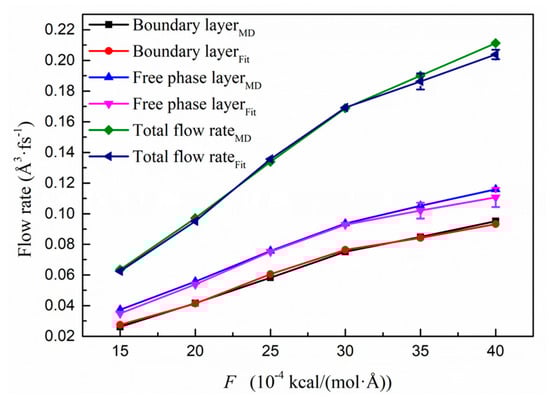 where Q is the flow rate. Compared with the flow rate using the NEMD simulations, as demonstrated in Equation (10), Figure 9 shows that the separate fitting worked well for the heterogeneous shale oil flow.