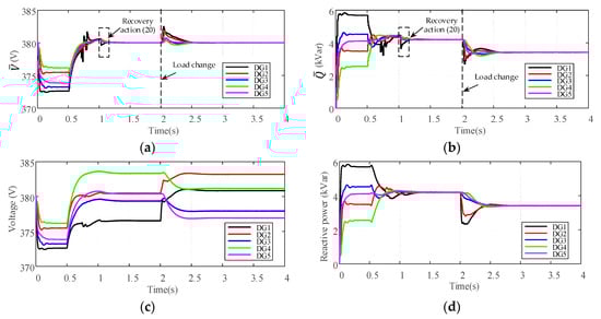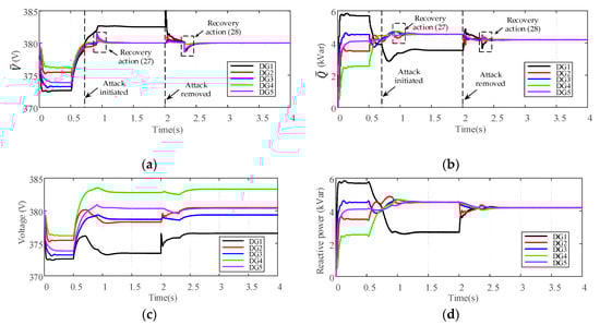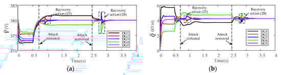 In order to verify the effectiveness of the proposed resilient secondary control scheme under transient disturbance, the simulation process is designed as follows: (1) From t = 0 s, the microgrid works in islanded mode and only the primary control is activated for all five DGs. (2) At t = 0.5 s, the proposed secondary control scheme is applied. (3) At t = 0.7 s, the transient disturbance signals and are injected into DG1 according to Equation (8). Then, the disturbance is cleared at t = 0.8s. (4) At t = 2 s, Load1 is reduced by the amount of 4kVar. The simulation results are shown in Figure 6.