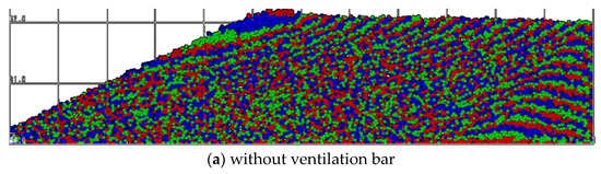 In general, it is known that a sliding line is generated in the powder layer when it flows. Shear stress due to powder pressure concentrates in the vicinity of the shear line, which causes the powder to expand during flow. In other words, when the powder pressure is high and the expansion occurs at the slip line, the porosity is considered to be increasing. In the lower right region of Figure 7a, the flow due to shear stress did not occur, because the initial packing structure was maintained and was moving parallel. Therefore, it is assumed that expansion at the slip line did not occur, and the porosity is considered to be reduced. A random structure was observed in the lower left region, suggesting that the charged particles were flowing and moving while disrupting the packing structure. The presence of flow due to shear stress is evidence of expansion at the slip line; as a result the porosity increased. In the upper region, the amount of expansion due to shear flow is lower than in the lower region, because the powder pressure due to deposition is lower. The porosity is lower than that of the lower region. In the case with a ventilation bar, the bar reduces the powder pressure of the lower region near the ventilation bars; thus the porosity is relatively low. To summarize, in the case of shear flow, the higher the powder pressure during flow, the higher the porosity. The expansion of the powder near the slip line and the increase in the porosity were also observed during particle ejection from the hopper [28]. One of the characteristic behaviors of the powders is confirmed here as well.