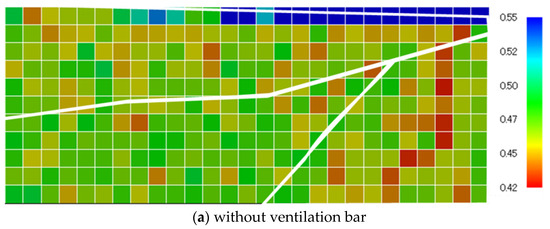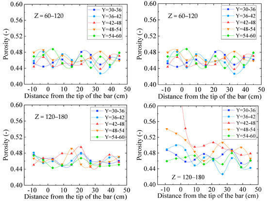 In Figure 5, as the porosity increases, the color of the unit cell becomes blue, and as it decreases, its color becomes red. Figure 6 shows the porosity values at each position of the packed bed. In the cases without ventilation bars, porosity ranged from 0.44 to 0.48. On the other hand, in the cases that included ventilation bars, porosity increased in the region (ii) where the bar was present. It is necessary to experimentally confirm the validity of these calculation results. Previous experimental studies have reported that installing ventilation bars increases porosity by about 1.2 times compared to without bars [26]. The calculated porosities in this study are distributed from 0.48 to 0.56 in the region with bars, which is roughly consistent with the values reported in the experiment. Note, in the refereed papers, that porosity is calculated from the permeability of the sinter bed. It is difficult to measure porosity directly by experiment, and it is considered a challenge.