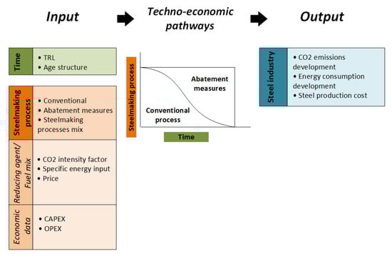- Fischedick, M.; Marzinkowski, J.; Winzer, P.; Weigel, M. Techno-economic evaluation of innovative steel production technologies. J. Clean. Prod. 2014, 84, 563–580. [Google Scholar] [CrossRef]