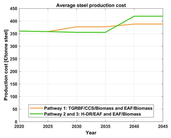 | Pathway 1 | TGRBF/BOF + CCS + biomass | 2030 | EAF/biomass | 2025 | Constant |