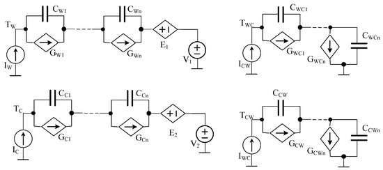 The other two subcircuits allow calculating excesses of the core temperature TCW and the winding temperature TWC caused by thermal coupling between the inductor components. In these subcircuits, current sources represent power dissipated in the winding IWC and in the core ICW. The networks connected to these sources model mutual transient thermal impedance between the core and the winding ZthCW(t). All transient thermal impedances occurring in the presented model are described by Equation (1).