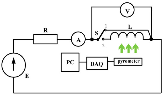 The considered set-up contains a voltage source E, a resistor R limiting the value of current, an ammeter, a voltmeter, the examined inductor L, a pyrometer, the acquisition data system DAQ, and a PC. To measure the value of DC current and DC voltage multimeters of the type UNIT UT-803 were used. The uncertainty of the measurements of DC voltage is ±0.025%, of the DC current ±0.1%, and of temperature measured by the pyrometer PT-3S is equal to ±3% [43].