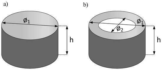 Inductors containing cup and toroidal cores made of ferrite material F-867 [44] were used for investigations. On each core, eight turns of copper wire in the enamel of the diameter 1 mm were wound. The examined inductors with cup cores of different dimensions were mounted on the printed circuit board, which was situated vertically during measurements. The inductor with the ring core was also arranged vertically. In Figure 3, the dimensions of the examined inductor cores are shown.