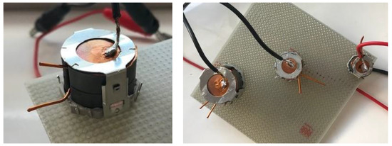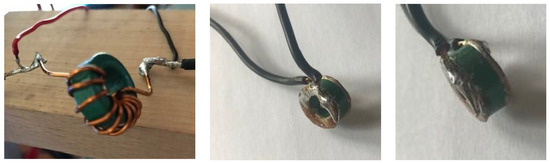 In Figure 4, the examined inductors with cup cores installed on the printed circuit board are shown, and in Figure 5 the examined inductor with the ring core is presented. During measurements ambient temperature was monitored and its value fluctuated between 21.9 °C and 23 °C. In both the figures, cables mounted to the ferromagnetic core are visible. These cables are indispensable to enable the current flow through the ferromagnetic core while heating this core. In Table 1 values of selected parameters of material F867 are collected, whereas in Table 2, values of geometrical parameters of the considered inductor cores are given. The inductors with the core whose parameters are collected in Table 2 are shown in Figure 4 and Figure 5.