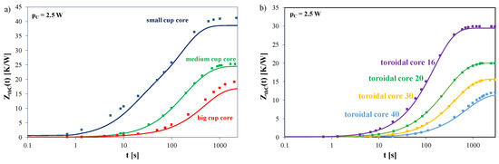 Measured and calculated waveforms of transient thermal impedance of the core for inductors with (a) cup and (b) toroidal cores of different dimensions.