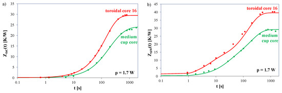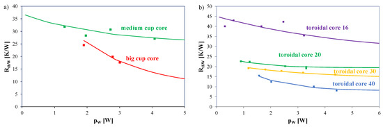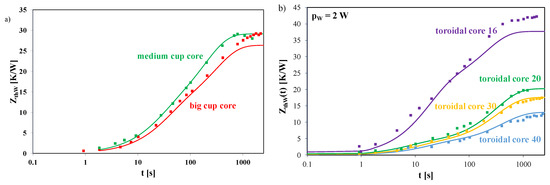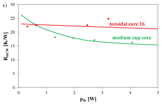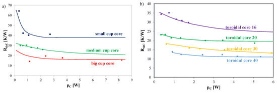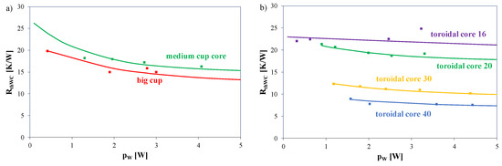Figure 16 presents the measured and calculated dependences of thermal resistances RthC, RthW and RthCW occurring in the nonlinear thermal model of the inductor on power dissipated in the core (Figure 16a) and in the winding (Figure 16b) for inductors with the medium cup core and the toroidal core 16. As mentioned in Section 3, both the considered cores have similar volume.