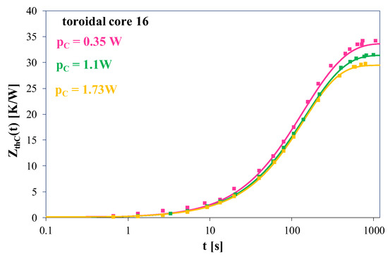 Using the measurement set-up (Figure 2), measurements of transient thermal impedances were performed. They were carried out for all the considered inductors at different values of power dissipated in the cores and windings. Based on the obtained measurement results, values of parameters of the nonlinear thermal model were determined for each considered inductor with the use of the method described in Section 2. For example, values of parameters of this model for inductors with the medium cup core and with the toroidal core of the external diameter equal to 16 mm are presented in Table 3.