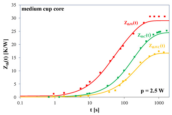 As can be seen, an increase in the dimensions of the cup core causes a decrease in the value of parameters Rth0 and Rth1, whereas parameter b have the same value for both considered cup cores. Additionally, increase in dimensions of the cup core causes a visible increase in the value of thermal capacitance.
