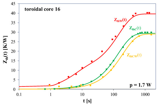 The value of voltage and current flowing through the core or the winding is regulated over a wide range of the measured waveforms ZthC(t), ZthW(t) and ZthCW(t) for different values of power pC and pW. Basing on the registered waveforms of the mentioned transient thermal impedances of the inductor, values of parameters Rth, ai, τthi occurring in the Equation (1) for every applied value of power pW and pC are estimated using the program ESTYM [42]. For every transient thermal impedance of the modelled inductor at the highest applied values of the dissipated power, average values of parameters ai and thermal capacitances occurring in the proposed thermal model are calculated on the basis of the Equation: