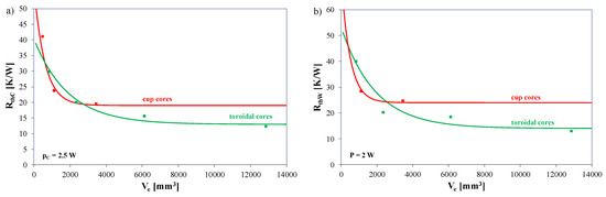 Figure 17 presents the measured (points) and calculated (lines) using Equation (8) dependences of thermal resistance of the core RthC, occurring in the nonlinear thermal model of the inductor on effective volume of the core for inductors with the cup cores (red colour) and the toroidal cores (green colours). Measurements and computations were performed at power dissipated in the core equal to 2 W.