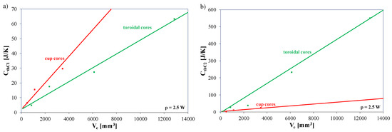 Measured and calculated dependences of selected thermal capacitance of the core CthC1 (a) and CthC2 (b) on the effective volume of the core for inductors with cup cores and toroidal cores.