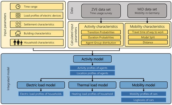 The energy transition is placing new demands on distribution grids in Germany. On the one hand, many renewable energy systems, e.g., photovoltaic systems, have been installed and on the other hand, load has also risen and is expected to rise further due to the electrification of the mobility and heating sectors [1,2]. Both developments are mainly taking place in the distribution grid and especially in low voltage grids [3]. Combined with digitalization, which enables producers and consumers to be more easily controlled, these developments are leading to new challenges and opportunities for electricity grids. Detailed simulation models are necessary to learn more about, and to develop solutions for, these upcoming challenges. One crucial factor, therefore, is a realistic and accurate model for the electrical consumption as well as mobility and heating demands of households, which are or will be the main source of electrical load in low voltage grids. To achieve this, three interwoven types of demand must be taken into account. First is the common electrical load of devices in the household, for example, ovens, televisions, and laptops. Second is the heating demand for space heating and hot water, which is increasingly frequently provided by heat pumps. The third is the mobility demand of the inhabitants, which, in the future, can be fulfilled by electric cars. Since these three demands are linked together via the user behavior, e.g., if the person of a single household is driving to work, the electric and thermal load in the empty home normally decreases, an integrated model shall be developed.