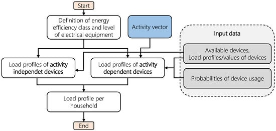 For generating the load profiles of the households the model iterates first over all households, and begins by creating the profiles for those devices which are always on and independent of the activities. Therefore, if the device is available due to the level of electrical equipment and the number of people, a load profile according to the efficiency class is randomly selected.