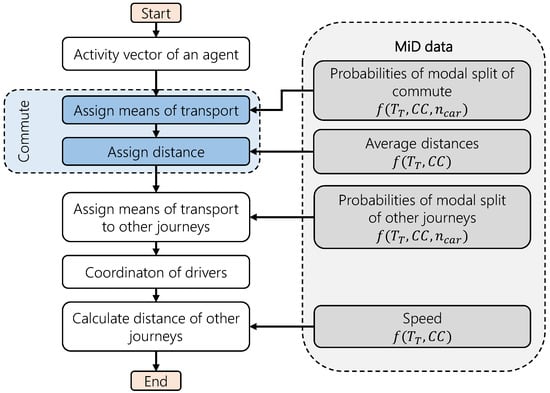 Figure 4 shows a simplified flowchart of the mobility model. The model iterates through every agent of the settlement. In the first step, the model assigns the agent a means of transport and a distance for the commute. The distance is determined by using the average distances out of the data set. The decision on the choice of transport mode is based on the probabilities of the modal split for commuting. Thus, it depends on the travel time , city category and the number of cars the household owns. Afterwards, the model iterates through the location vector to find every journey (commute, other journey) of the agent. For the other journeys, the modal split probabilities based on the MiD are used to decide if the trip is made by car. The information on every journey made by the car is extracted to a logbook table. The logbook contains the time step and location where every drive begins and ends. If a household has two agents who are authorized to drive but only one vehicle, the logbooks must be harmonized. Therefore, the agent with the higher travel time within the regarded time range is prioritized. The prioritized agent may always use the car. The other agent may only use the car if the prioritized agent is not disturbed by it. Afterward, the distance of every journey within the logbook is determined. As mentioned before, a deterministic approach is used for this. The model selects a real speed from the MiD-data with the same city category and travel time and calculates the distance of the journey. Exceptions are drives from home to another location and back again. For those cases, the same distance is selected for outward and return journeys. In the last step, each drive is assigned to an electrical consumption in kWh. A simple consumption model based on measured values out of [35] is used for this purpose. In this reference, the consumption of electric vehicles was determined as a function of average speed, outside temperature, and vehicle class. The model interpolates a suitable consumption based on the measured values as a function of the three influencing variables. The electrical consumption of each drive is stored in the logbook of the vehicle. The results of the mobility generator are logbooks and mobility profiles of every car within the settlement.